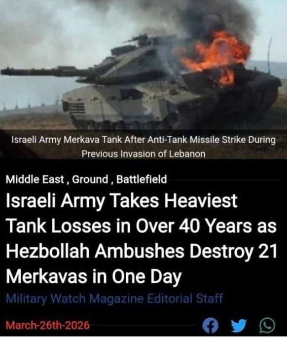 ЦАХАЛ потерял больше двух десятков танков «Меркава» всего за сутки — это самые тяжёлые потери за последние 40 лет. Military Watch Magazine сообщил, что бойцы ливанской «Хезболлы» жгли технику израильтян из засад. При этом они ещё и беспокоят север Израиля артиллерией и ракетными ударами.