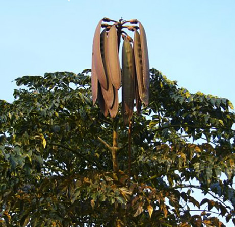 Смысловое значение названия ороксилума связано с греческими корнями: "Орос" - горы и "Ксилон" - древесина, что подразумевает «горные деревья». Именно стручки вдохновили давать этому растению столь пугающие прозвища, такие как «дамоклово» из-за их схожести с виселицами. Несмотря на свою жутковатую репутацию, данное дерево использует на практике: в Индии и Китае довольно часто изготавливают из него зонтики и крыши. Плоды и листья можно употреблять как в сыром, так и в отварном виде, а также находят применение в медицине и косметологии.