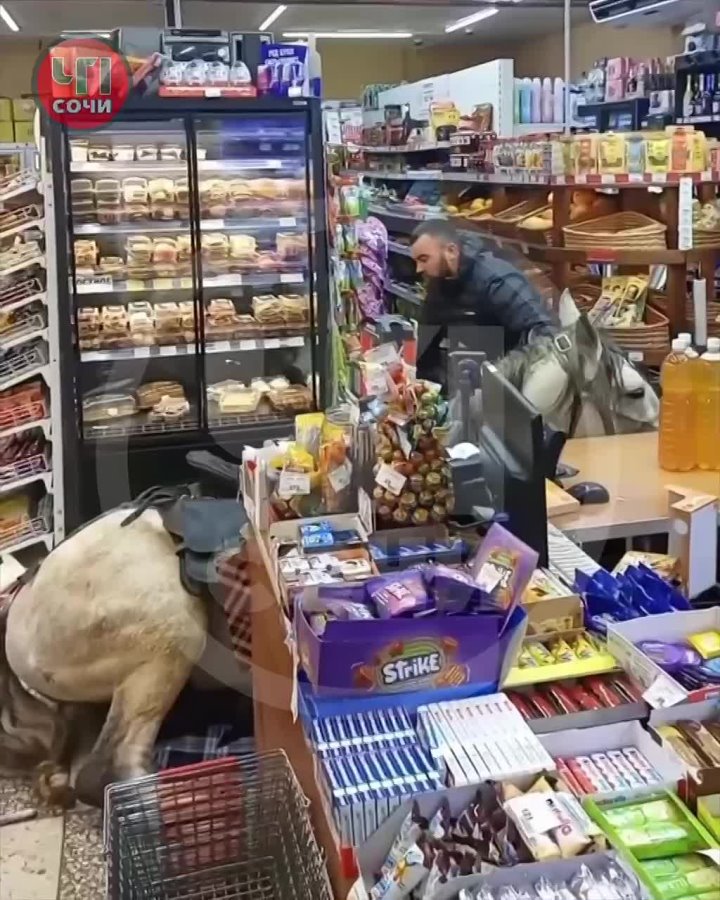 По словам местных, это случилось в горах Сочи. Мужчина зачем-то заехал в магазин прямо на коне, тот запаниковал и устроил погром.sochi_onlineКубань 24 в MAX