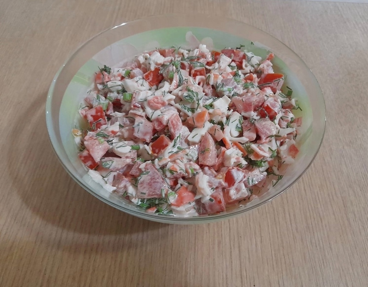 Прежде всего, необходимо тщательно измельчить укроп. Затем крабовое мясо нарезают произвольными кусочками. Помидоры стоит порезать на кубики — выбирайте мясистые сорта, чтобы салат был более насыщенным.