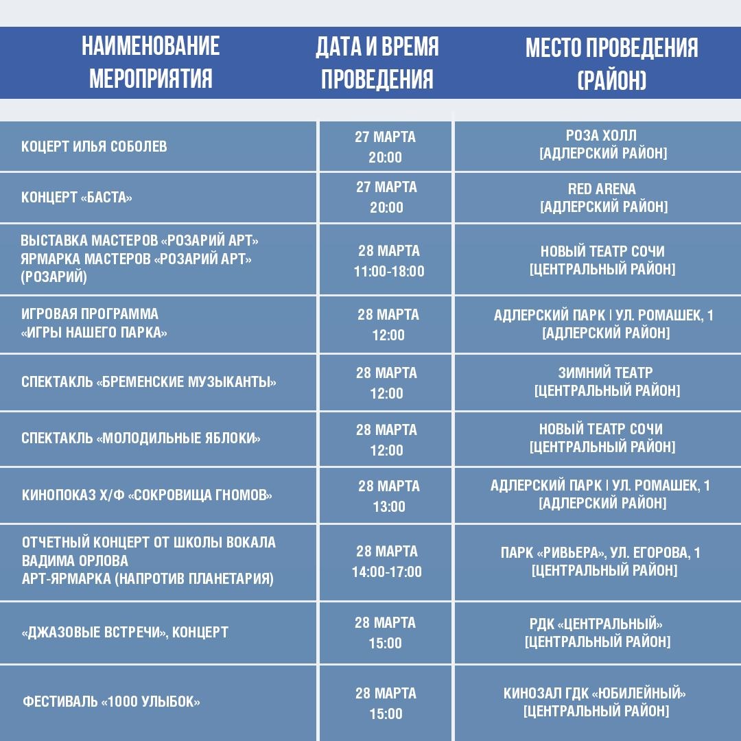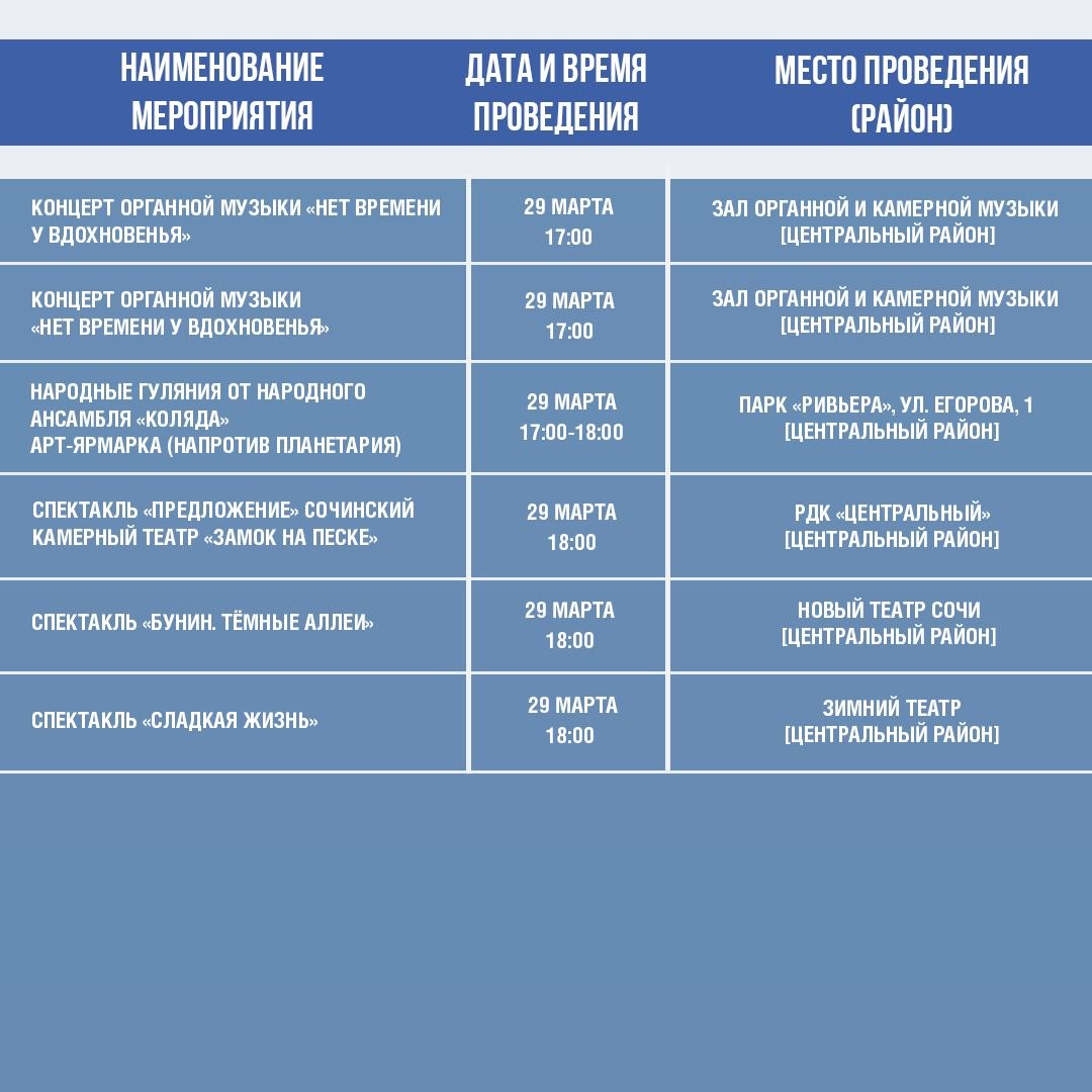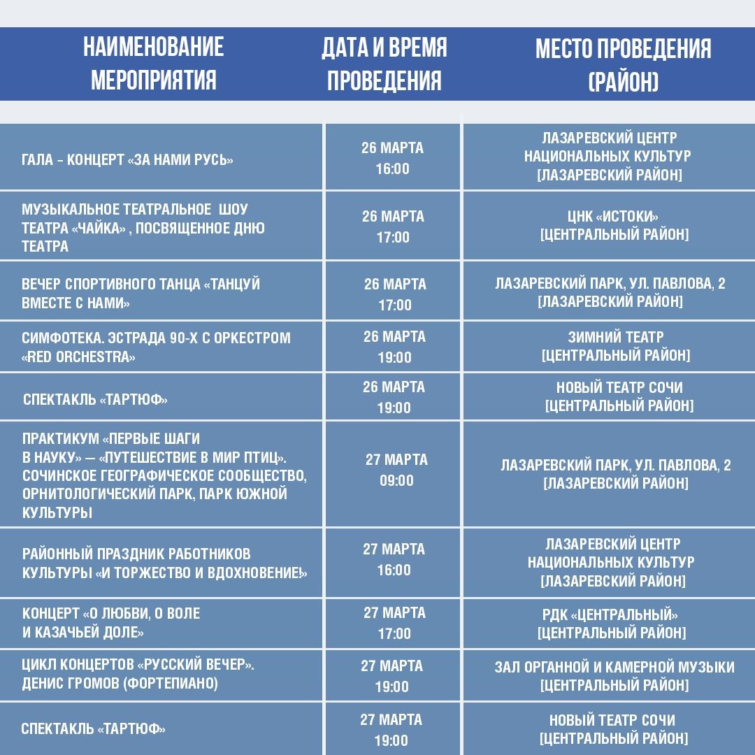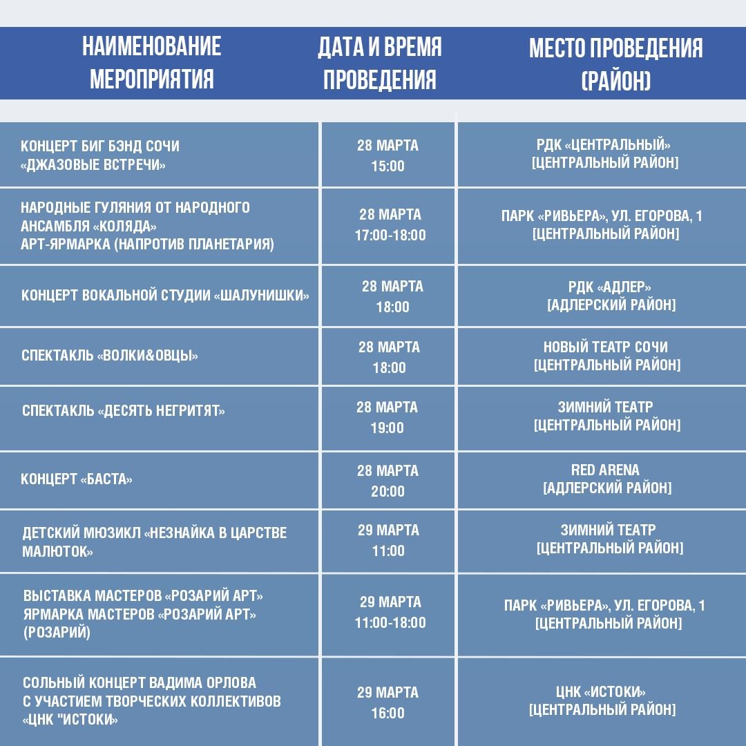Афиша культурных и досуговых мероприятий в Сочи с 17 по 22 марта.