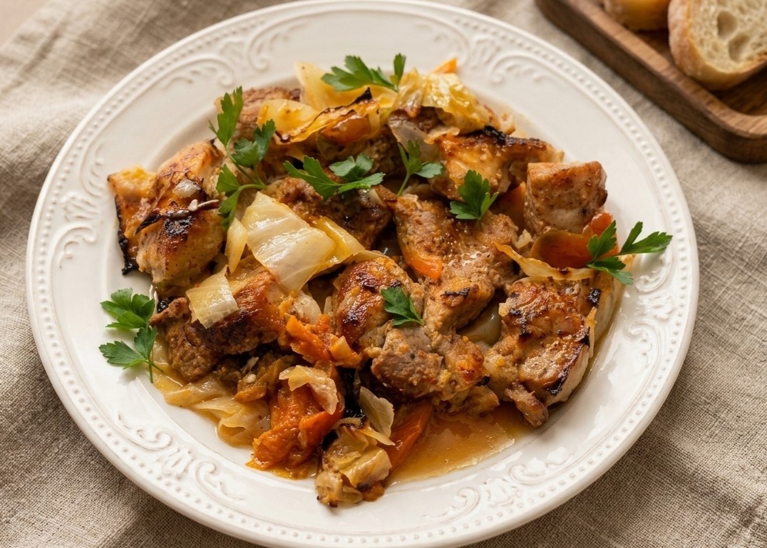 Рецепт 1: Свинина с капустой, перцем и морковью в форме