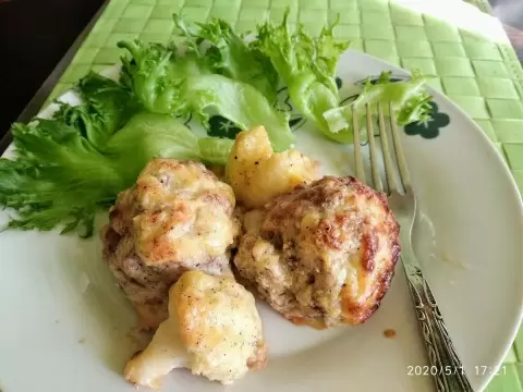 4) Сформируйте тефтели, выложите их и соцветия «в шахматном порядке» на противень, полейте соусом и запекайте при 180 °C около 40 минут.