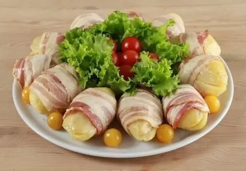 Затем начинка аккуратно помещается в половинки картофеля, которые после этого складываются вместе и оборачиваются полосками бекона. Полуфабрикаты стоит разместить на решетке, установленной на противне, и запекать в предварительно разогретой до 200 градусов Цельсия духовке в течение 10–15 минут. Украсить блюдо можно свежими листьями салата и помидорами черри.