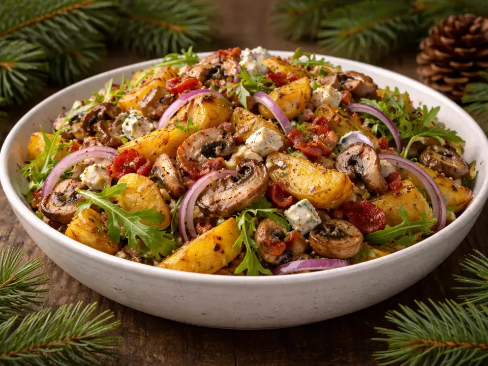 Ищете идеальное блюдо для праздничного стола? Салат с жареным картофелем, грибами и беконом станет звездой любого застолья. Это сочетание знакомых продуктов в неожиданном исполнении дарит новые вкусовые ощущения. Ароматный бекон, обжаренная картошка, пикантный сыр и яркая зелень создают восхитительный баланс, от которого просто невозможно отказаться. Блюдо получается насыщенным, а его подготовка не займет много времени — идеальный вариант для тех, кто ждет гостей.