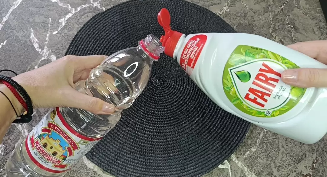 - Используйте горячую воду — она значительно усиливает действие уксуса и моющего средства.